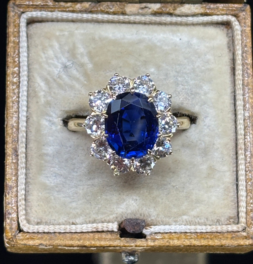 This is a rare opportunity to own an exceptional Ceylon sapphire of true investment quality. At the heart of this oval cluster ring sits a majestic 4.49ct Ceylon sapphire — a stone our buyer described as the finest he has encountered for colour, light play and clarity. Its deep, vivid blue draws the eye with an almost velvety saturation, lively internal scintillation and a depth that reads beautifully in every light. Importantly, this stone shows no sign of heat treatment, a distinction that adds provenance and long term value in today’s market.